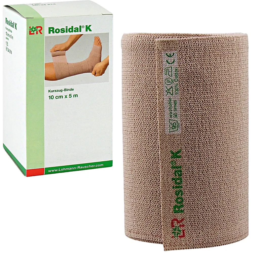 - Rosidal K Kısa Gerilmeli Kompresyon Bandajı Bu bandaj ,hiç bir elastomerik lif içermez .Sadece dokuma şeklinden dolayı elastik özelliğe sahiptir. Bu bandajlar, istenen basıncı elde edebilmek için kullanılır. Uzmanlaşılan bandajlama tekniği ve lenf ödemde gereken basıncı sağlaması nedeniyle, birçok yerde ihtiyaç duyulmaktadır. Kompresyon Bandajı (Ten rengi)