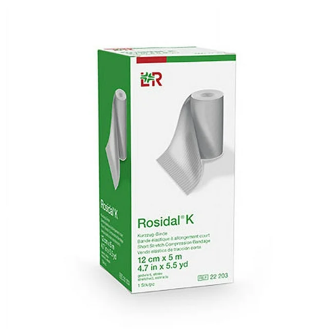 - Rosidal K Kısa Gerilmeli Kompresyon Bandajı Bu bandaj ,hiç bir elastomerik lif içermez .Sadece dokuma şeklinden dolayı elastik özelliğe sahiptir. Bu bandajlar, istenen basıncı elde edebilmek için kullanılır. Uzmanlaşılan bandajlama tekniği ve lenf ödemde gereken basıncı sağlaması nedeniyle, birçok yerde ihtiyaç duyulmaktadır. Kompresyon Bandajı (Ten rengi)